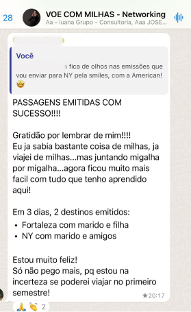 Simmm. Além do grupo com várias oportunidades de passagens e acúmulo de milhas, você terá acesso ao grupo de networking, com muitas dicas do pessoal que já está nos grupos. Ahhh, mesmo assim, caso precise de uma ajudinha extra, você terá desconto exclusivo para minha consultoria, uma hora comigo, por vídeo, seja para tirar dúvidas ou saber os primeiros passos.
